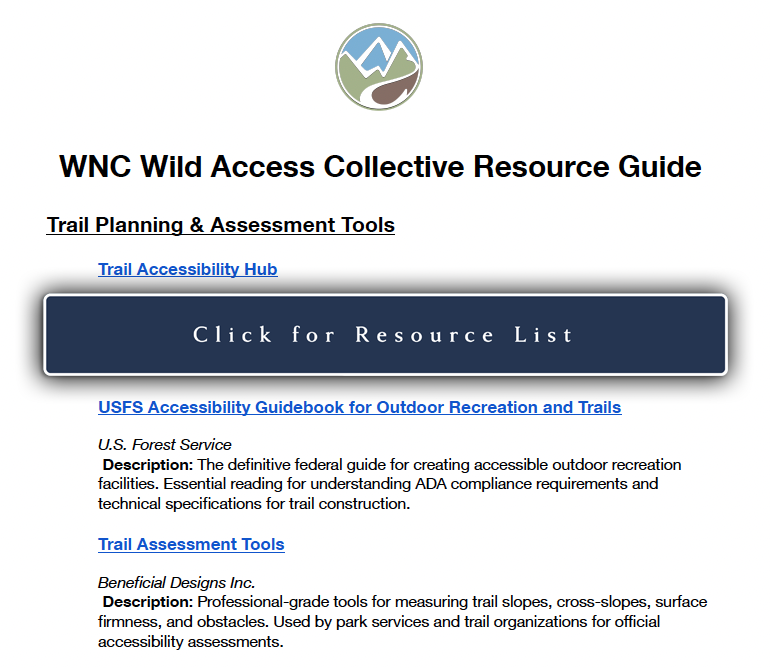 Wild Access Collective is developing a comprehensive Resource List to support adventurers of all abilities and anyone working to improve outdoor accessibility. Check out our Resource Guide. We welcome your suggestions through our "Share a Resource" form below.